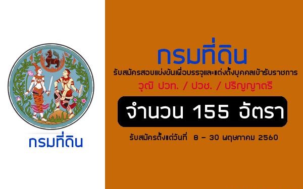 ด้วย กรมที่ดิน รับสมัครสอบแข่งขันเพื่อบรรจุและแต่งตั้งบุคคลเข้ารับราชการ จำนวน 155 อัตรา