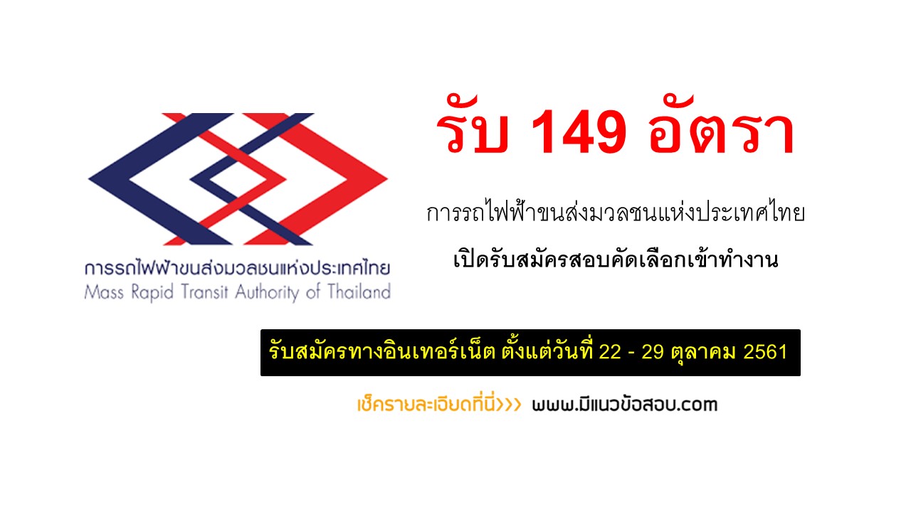 การรถไฟฟ้าขนส่งมวลชนแห่งประเทศไทย เปิดรับสมัครสอบคัดเลือกเข้าทำงาน จำนวน 149 อัตรา รับสมัครทางอินเทอร์เน็ต ตั้งแต่วันที่ 22 - 29 ตุลาคม 2561ประกาศการรถไฟฟ้าขนส่งมวลชนแห่งประเทศไทย เรื่อง การรับสมัครงานการรถไฟฟ้าขนส่งมวลชนแห่งประเทศไทย (รฟม) มีความประสงค์รับสมัครบุคคลเพื่อปฏิบัติงานในสังกัดต่างๆ จำนวน 149 อัตรา โดยมีรายละเอียดดังนี้ตำแหน่งที่เปิดรับสมัครสอบ1 ตำแหน่งวิศวกร ระดับ 4-5 (โยธา) จำนวน 30 อัตรา2 ตำแหน่งวิศวกร ระดับ 4 (ไฟฟ้ากำลัง) จำนวน 5 อัตรา3 ตำแหน่งวิศวกร ระดับ 4 (ไฟฟ้าสื่อสาร/อิเล็กทรอนิกส์) จำนวน 4 อัตรา 4 ตำแหน่งวิศวกร ระดับ 4 (เครื่องกล) จำนวน 9 อัตรา 5 ตำแหน่งวิศวกร ระดับ 4-5 (คอมพิวเตอร์) จำนวน 4 อัตรา 6 ตำแหน่งวิศวกร ระดับ 4-5 (โยธา/ขนส่ง) จำนวน 6 อัตรา 7 ตำแหน่งสถาปนิก ระดับ 4 จำนวน 1 อัตรา 8 ตำแหน่งพนักงานวิทยาศษสตร์ ระดับ 5 จำนวน 1 อัตรา 9 ตำแหน่งพนักงานอาชีวอนามัยและความปลอดภัย ระดับ 4 จำนวน 1 อัตรา 10 ตำแหน่งเศรษฐกร ระดับ 5 จำนวน 1 อัตรา 11 ตำแหน่งพนักงานบัญชี ระดับ 4 จำนวน 3 อัตรา12 ตำแหน่งพนักงานการเงิน ระดับ 4 จำนวน 2 อัตรา 13 ตำแหน่งพนักงานบริหารระบบคอมพิวเตอร์ ระดับ 4 จำนวน 1 อัตรา 14 ตำแหน่งพนักงานวิเคราะห์ระบบคอมพิวเตอร์ ระดับ 4 จำนวน 3 อัตรา 15 ตำแหน่งพนักงานบริหารธุรกิจ ระดับ 4-5 จำนวน 11 อัตรา 16 ตำแหน่งพนักงานบริหารความเสี่ยง ระดับ 5 จำนวน 2 อัตรา17 ตำแหน่งพนักงานวิเคราะห์นโยบายและแผน ระดับ 5 จำนวน 10 อัตรา 18 ตำแหน่งพนักงานตรวจสอบ ระดับ 4 (ด้านเทคโนโลยีสารสนเทศ) จำนวน 1 อัตรา 19 ตำแหน่งพนักงานตรวจสอบ ระดับ 4 (ด้านบัญชีการเงิน) จำนวน 1 อัตรา 20 ตำแหน่งพนักงานตรวจสอบ ระดับ 4 จำนวน 2 อัตรา 21 ตำแหน่งนิติกร ระดับ 4 จำนวน 12 อัตรา 22 ตำแหน่งพนักงานทรัพยากรบุคคล ระดับ 4 จำนวน 2 อัตรา 23 ตำแหน่งพนักงานบริหารพัสดุ ระดับ 4 จำนวน 8 อัตรา 24 ตำแหน่งพนักงานบริหารงานทั่วไป ระดับ 4-5 จำนวน 26 อัตรา 25 ตำแหน่งพนักงานรักษาเขตทาง ระดับ 4 จำนวน 1 อัตรา 26 ตำแหน่งพนักงานประชาสัมพันธ์ ระดับ 4 จำนวน 2 อัตราการรับสมัครสอบผู้ประสงค์จะสมัครเข้ารับการคัดเลือกสามารถสมัครผ่านใบสมัครออนไลน์ทางเว็บไซต์เท่านั้น ตั้งแต่วันที่ 22 -29 ตุลาคม 2561 ที่เว็บไซต์ http://www.mrta.co.th/ หัวข้อ "สมัครงาน online"รายละเอียดเพิ่มเติม-เอกสารไฟล์แนบ