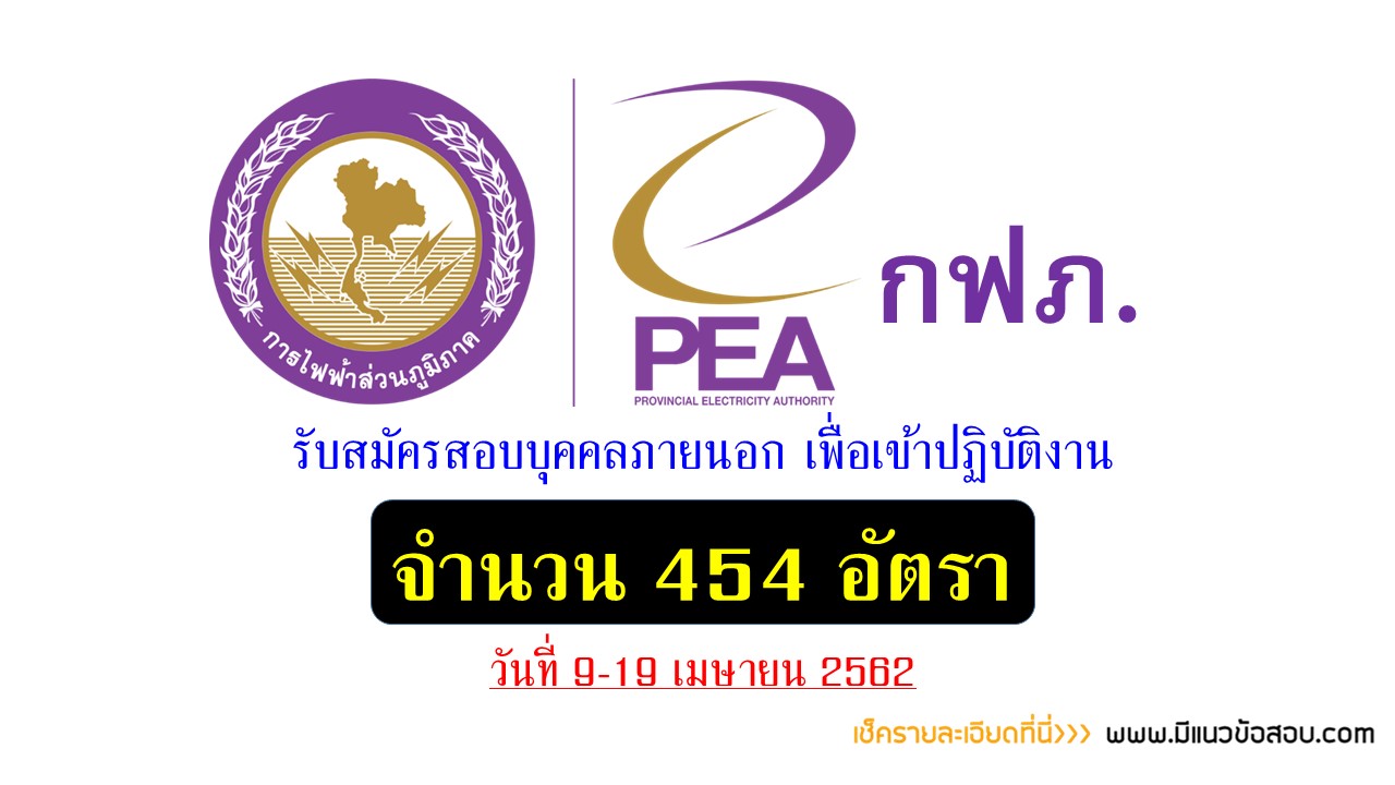 การไฟฟ้าส่วนภูมิภาค (PEA) มีความประสงค์จะรับสมัครสอบคัดเลือกจากบุคคลภายนอก เพื่อเข้าปฏิบัติงานกับ PEA โดยมีอัตรารับสมัครในหน่วยงานสำนักงานใหญ่ จำนวน 102 อัตรา และสำนักงานส่วนภูมิภาคทั่วประเทศ จำนวน 352 อัตรา รวมจำนวน 454 อัตราแบ่งเป็นดังนี้1.การไฟฟ้าส่วนภูมิภาค สำนักงานใหญ่ปฏิบัติงานที่กรุงเทพฯ(จำนวน 98 อัตรา)2.การไฟฟ้าเขต 1 (เชียงใหม่) ภาค 1ปฏิบัติงานที่จังหวัดลำพูน, ลำปาง,แม่ฮ่องสอน, พะเยา, เชียงใหม่, เชียงราย(จำนวน 34 อัตรา)3.การไฟฟ้าเขต 2 (พิษณุโลก) ภาค 1ปฏิบัติงานที่จังหวัดอุตรดิตถ์, แพร่, น่าน,กำแพงเพชร, ตาก, สุโขทัย, พิษณุโลก, พิจิตร(จำนวน 37 อัตรา)4.การไฟฟ้าเขต 3 (ลพบุรี) ภาค 1ปฏิบัติงานที่จังหวัดลพบุรี, สิงห์บุรี, ชัยนาท,นครสวรรค์, อุทัยธานี, เพชรบูรณ์(จำนวน 17 อัตรา)5.การไฟฟ้าเขต 1 (อุดรธานี) ภาค 2ปฏิบัติงานที่จังหวัดหนองบัวลำภู, ขอนแก่น,อุดรธานี, เลย,หนองคาย, สกลนคร,นครพนม, บึงกาฬ(จำนวน 48 อัตรา)6.การไฟฟ้าเขต 2 (อุบลราชธานี) ภาค 2ปฏิบัติงานที่จังหวัดศรีสะเกษ, อุบลราชธานี,ยโสธร,อำนาจเจริญ, มหาสารคาม, ร้อยเอ็ด,กาฬสินธุ์, มุกดาหาร(จำนวน 19 อัตรา)7.การไฟฟ้าเขต 3 (นครราชสีมา) ภาค 2ปฏิบัติงานที่จังหวัดนครราชสีมา, บุรีรัมย์,สุรินทร์, ชัยภูมิ(จำนวน 25 อัตรา)8.การไฟฟ้าเขต 1 (อยุธยา) ภาค 3ปฏิบัติงานที่จังหวัดปทุมธานี,พระนครศรีอยุธยา, อ่างทอง, สระบุรี,ปราจีนบุรี, นครนายก, สระแก้ว(จำนวน 30 อัตรา)9.การไฟฟ้าเขต 2 (ชลบุรี) ภาค 3ปฏิบัติงานที่จังหวัดชลบุรี, ระยอง, จันทบุรี,ตราด, ฉะเชิงเทรา(จำนวน 50 อัตรา)10.การไฟฟ้าเขต 3 (นครปฐม) ภาค 3ปฏิบัติงานที่จังหวัดกาญจนบุรี, สุพรรณบุรี,นครปฐม, สมุทรสาคร, ราชบุรี (เฉพาะบ้านโป่ง)(จำนวน 23 อัตรา)11.การไฟฟ้าเขต 1 (เพชรบุรี) ภาค 4ปฏิบัติงานที่จังหวัดราชบุรี (ยกเว้นบ้านโป่ง),สมุทรสงคราม,เพชรบุรี, ประจวบคีรีขันธ์,ระนอง, ชุมพร(จำนวน 17 อัตรา)12.การไฟฟ้าเขต 2 (นครศรีธรรมราช) ภาค 4ปฏิบัติงานที่จังหวัดนครศรีธรรมราช, กระบี่,พังงา, ภูเก็ต, สุราษฎร์ธานี, ตรัง(จำนวน 29 อัตรา)13.การไฟฟ้าเขต 3 (ยะลา) ภาค 4 ปฏิบัติงานที่จังหวัดสงขลา, สตูล, พัทลุง,ปัตตานี, ยะลา, นราธิวาส(จำนวน 27 อัตรา)การรับสมัครผู้สนใจสามารถสมัครสอบทางระบบรับสมัครออนไลน์ ในตำแหน่งและเขตพื้นที่ปฏิบัติงานต่างๆ พร้อมอัปโหลดเอกสารประกอบการสมัครต่างๆ ตามประเภท และรูปแบบที่ PEA กำหนด ภายในวันที่ 9-19 เมษายน 2562(ตลอด 24 ชั่วโมง) ไม่เว้นวันหยุดราชการ ที่ เว็บไซต์ http://www.pea.co.th หัวข้อ “ข่าวรับสมัครงาน”ประกาศรับสมัคร | ลิ้งสมัคร