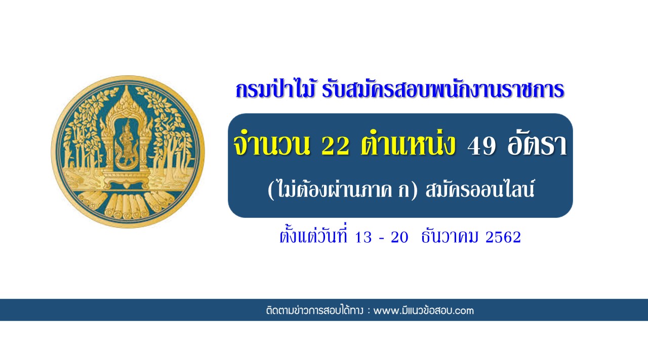 กรมป่าไม้ รับสมัครสอบพนักงานราชการ 49 อัตรา (ไม่ต้องผ่านภาค ก) วันที่ 13-20 ธันวาคม 2562ประกาศกรมป่าไม้ เรื่อง รับสมัครบุคคลเพื่อเลือกสรรเป็นพนักงานราชการทั่วไป สังกัดกรมป่าไม้ ประจำปีงบประมาณ พ.ศ. 2563ตำแหน่งที่รับสมัคร(01) ผู้ช่วยเจ้าหน้าที่การเกษตร จำนวน 2 อัตรา(02) ผู้ช่วยพนักงานพิทักษ์ป่า จำนวน 4 อัตรา(03) เจ้าหน้าที่ตรวจป่า จำนวน 9 อัตรา(04) เจ้าหน้าที่ธุรการ (ม.3) จำนวน 6 อัตรา(05) เจ้าหน้าที่ธุรการ (ปวช.) จำนวน 3 อัตรา(06) เจ้าหน้าที่บันทึกข้อมูล จำนวน 3 อัตรา(07) เจ้าหน้าที่การเงินและบัญชี จำนวน 1 อัตรา(08) เจ้าหน้าที่การเกษตร จำนวน 1 อัตรา(09) เจ้าพนักงานพัสดุ จำนวน 2 อัตรา(10) พนักงานพิทักษ์ป่า จำนวน 1 อัตรา(11) ช่างเครื่องยนต์ จำนวน 2 อัตรา(12) ช่างไฟฟ้า จำนวน 1 อัตรา(13) ช่างศิลป์ จำนวน 1 อัตรา(14) ช่างสำรวจ จำนวน 2 อัตรา (15) เจ้าพนักงานการเกษตร จำนวน 1 อัตรา(16) เจ้าหน้าที่เครื่องคอมพิวเตอร์ จำนวน 1 อัตรา(17) เจ้าหน้าที่บริหารงานทั่วไป จำนวน 1 อัตรา(18) เจ้าหน้าที่วิเคราะห์นโยบายและแผน จำนวน 1 อัตรา(19) นักวิชาการป่าไม้ จำนวน 3 อัตรา(20) นักวิชาการเผยแพร่ จำนวน 2 อัตรา(21) นักวิทยาศาสตร์ จำนวน 1 อัตรา(22) ผู้ช่วยนักวิจัย จำนวน 1 อัตราการรับสมัครสอบผู้ประสงค์จะสมัคร สามารถสมัครได้ทางอินเทอร์เน็ต ตั้งแต่วันที่ 13 - 20 ธันวาคม 2562 ตลอด 24 ชั่วโมง ไม่เว้นวันหยุดราชการ ที่เว็บไซต์ https://forest.thaijobjob.comประกาศรับสมัคร | ลิ้งสมัคร