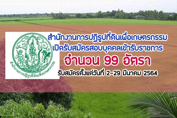 สำนักงานการปฏิรูปที่ดินเพื่อเกษตรกรรม รับสมัครสอบแข่งขันเพื่อบรรจุและแต่งตั้งบุคคลเข้ารับราชการ 99 อัตรา รับสมัครตั้งแต่วันที่ 2-29 มีนาคม 2564