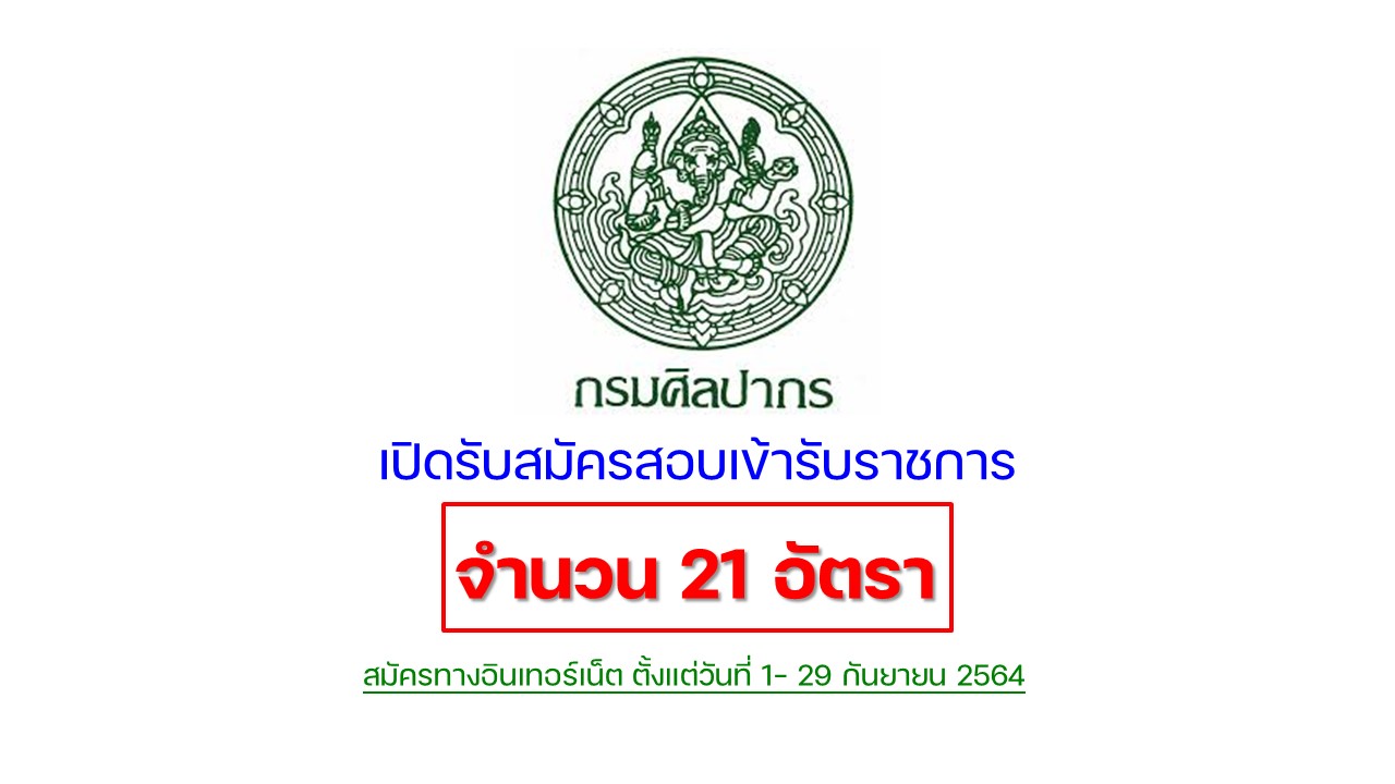 กรมศิลปากร เปิดรับสมัครสอบเข้ารับราชการ 21 อัตรา สมัครทางอินเทอร์เน็ต ตั้งแต่วันที่ 1- 29 กันยายน 2564