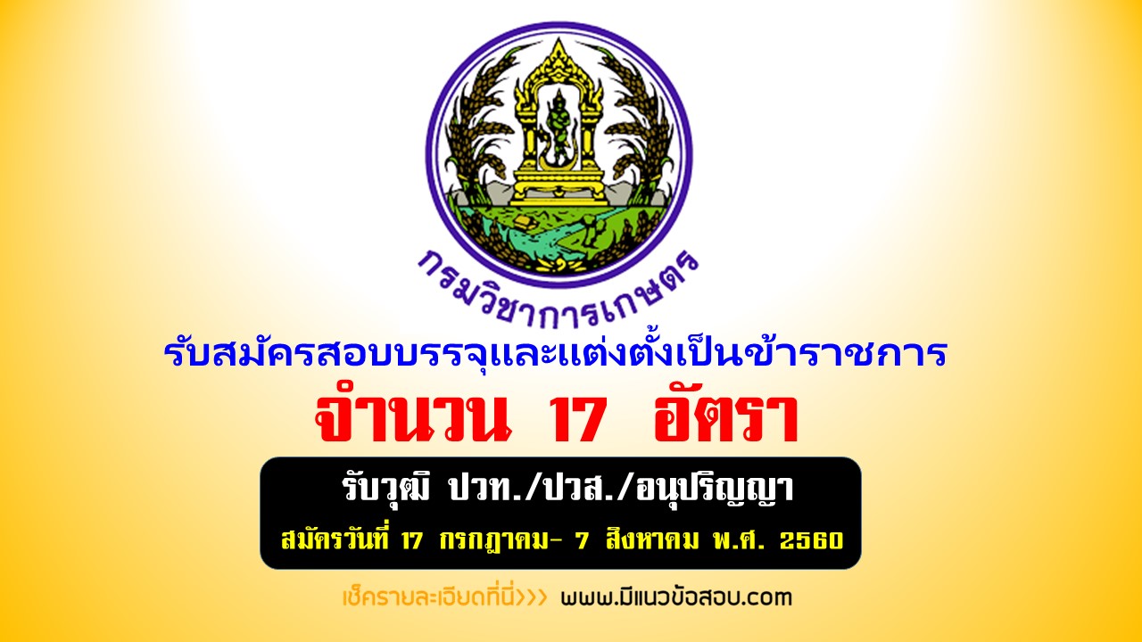 ((แชร์ เลย))กรมวิชาการเกษตร รับสมัครบุคคลเพื่อบรรจุและแต่งตั้งเป็นข้าราชการ 17 อัตรา โดยเปิดรับสมัครตั้งแต่วันที่ 17 กรกฎาคม- 7 สิงหาคม พ.ศ. 2560 สมัครทาง Internet