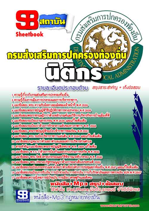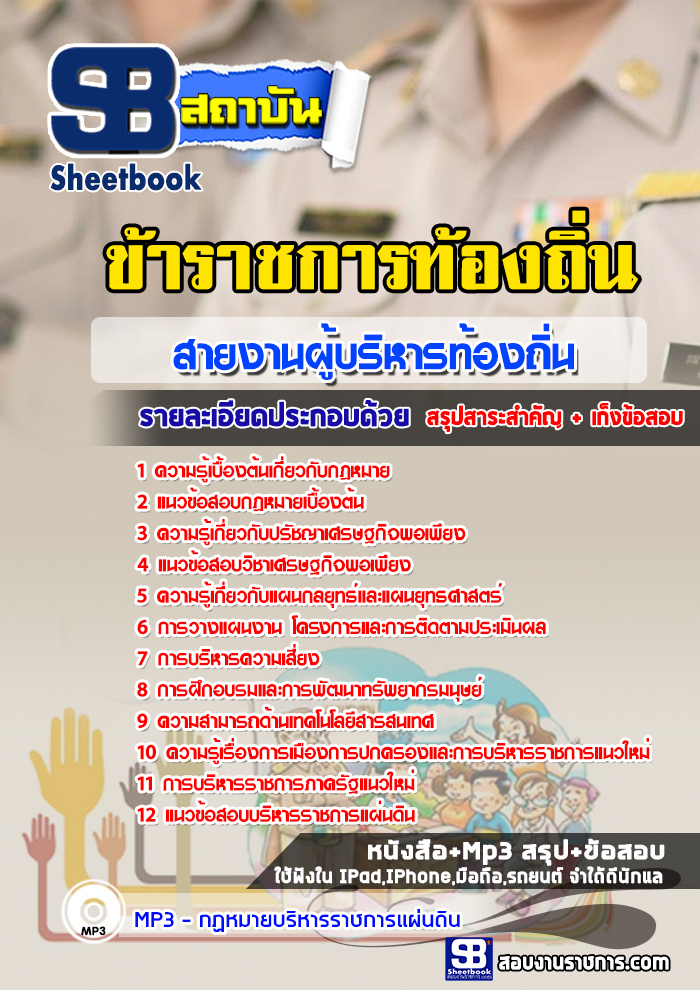 #แนวข้อสอบข้าราชการท้องถิ่น สายงานผู้บริหารท้องถิ่น1 ความรู้เบื้องต้นเกี่ยวกับกฎหมาย2 แนวข้อสอบกฎหมายเบื้องต้น3 ความรู้เกี่ยวกับปรัชญาเศรษฐกิจพอเพียง 4 แนวข้อสอบวิชาเศรษฐกิจพอเพียง5 ความรู้เกี่ยวกับแผนกลยุทธ์และแผนยุทธศาสตร์6 การวางแผนงาน โครงการและการติดตามประเมินผล7 การบริหารความเสี่ยง8 การฝึกอบรมและการพัฒนาทรัพยากรมนุษย์9 ความสามารถด้านเทคโนโลยีสารสนเทศ10 ความรู้เรื่องการเมืองการปกครองและการบริหารราชการแนวใหม่11 การบริหารราชการภาครัฐแนวใหม่12 แนวข้อสอบบริหารราชการแผ่นดินMP3 - กฏหมายบริหารราชการแผ่นดิน