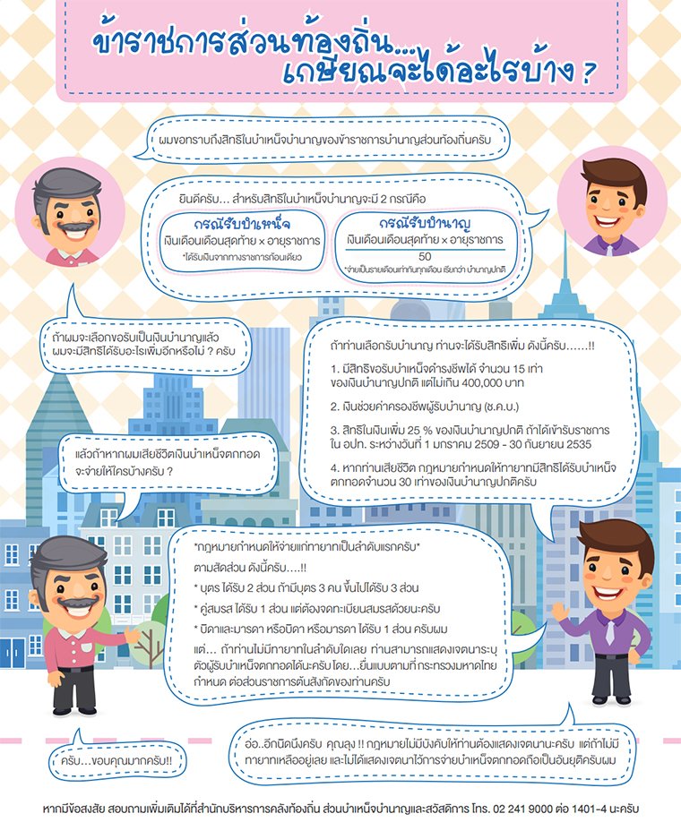 หากมีข้อสงสัย สอบถามเพิ่มเติมได้ที่สำนักบริหารการคลังท้องถิ่น ส่วนบำเหน็จบำนาญและสวัสดิการ โทร 02 241 9000 ต่อ 1401-4